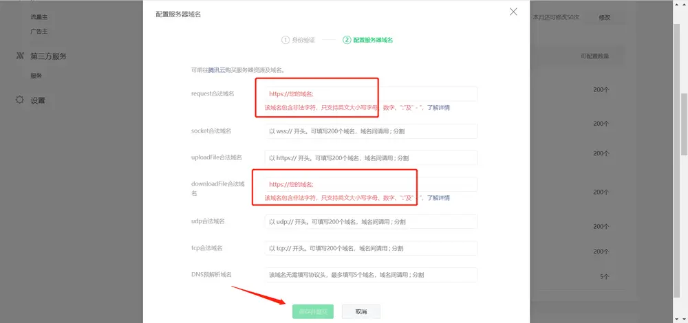 配置好request合法域名和downloadFile合法域名后点击保存即可