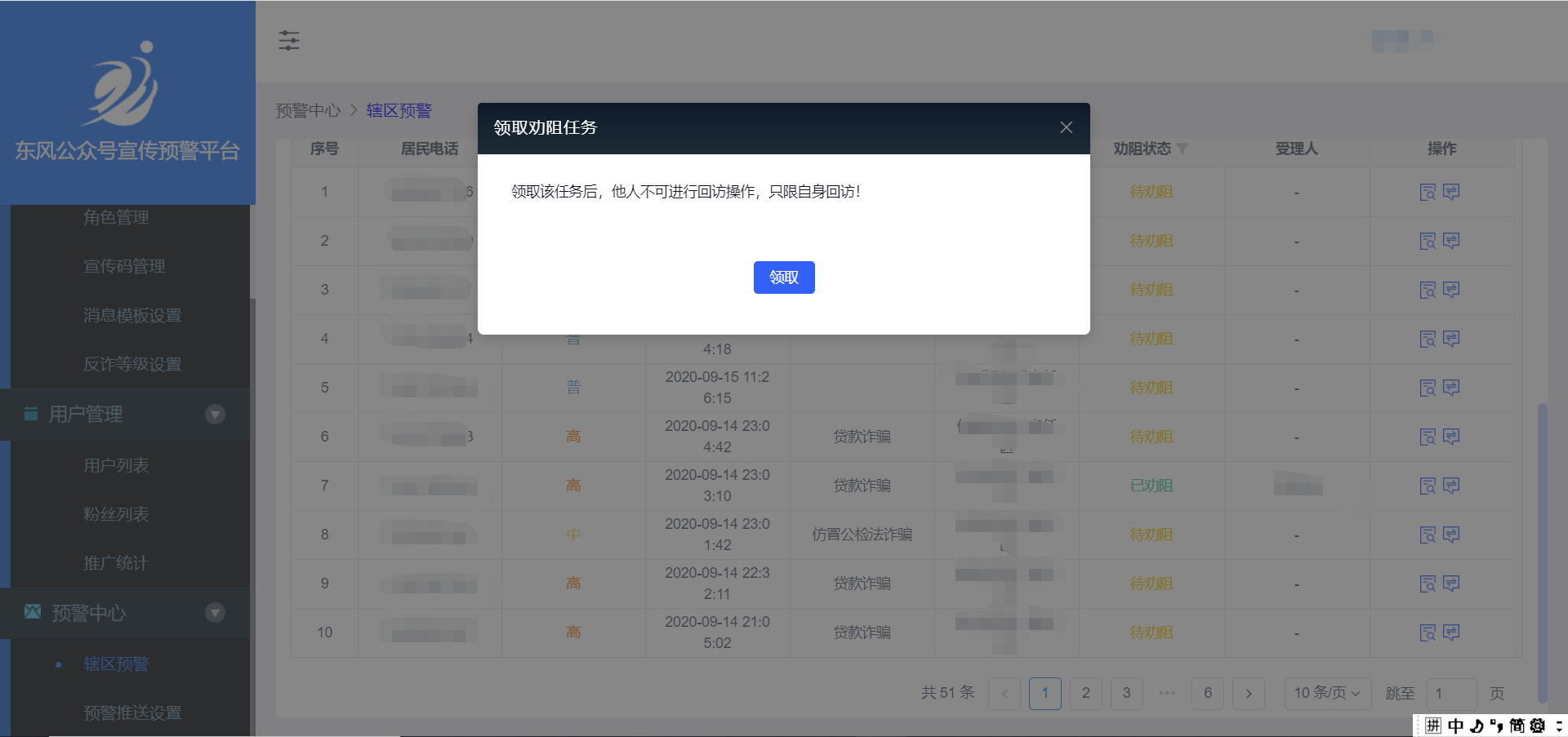 点击“领取”后,即可进行劝阻并添加劝阻记录。