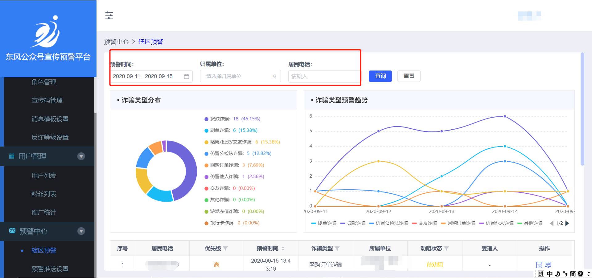 可在在红框中进行筛选后,查看诈骗分布类型和诈骗类型预警趋势图