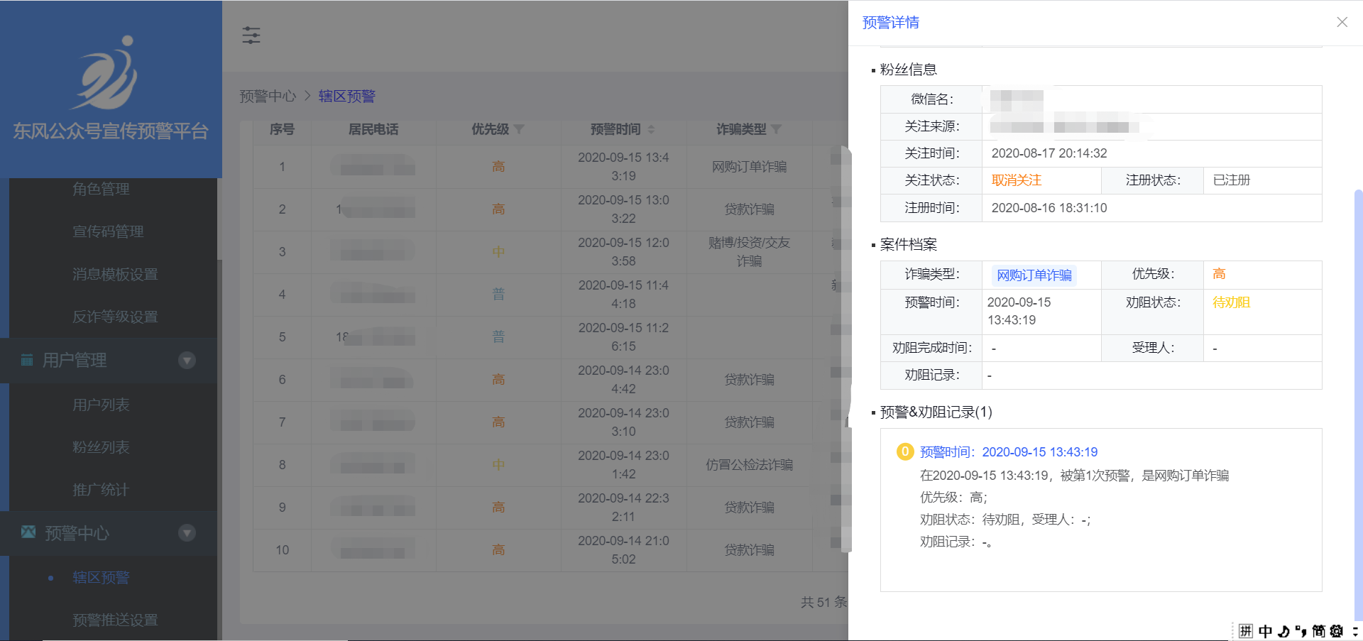 点击左侧按钮后,可查看该工单的预警劝阻记录,如下图所示: