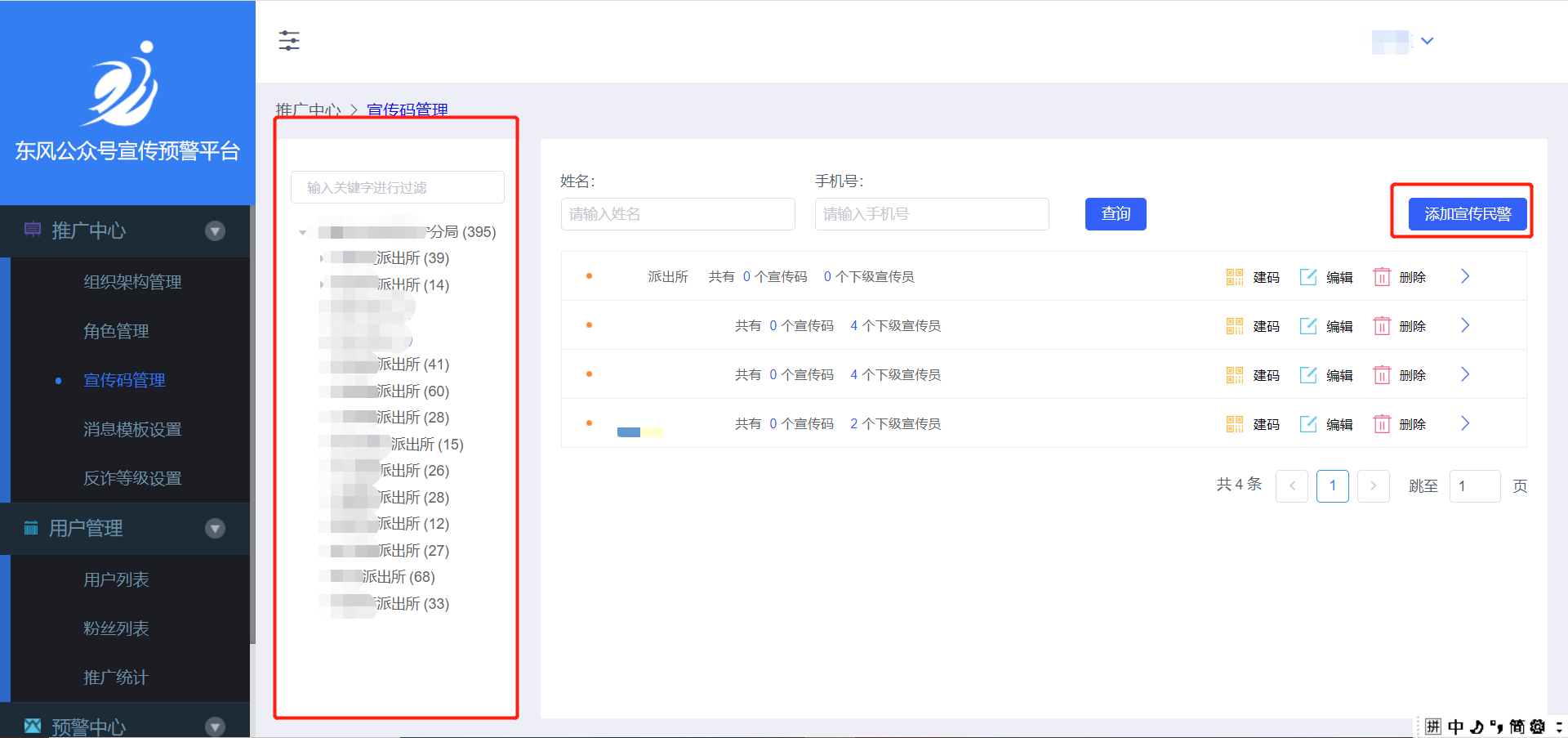 >[info] 所有单位管理员【市局管理员、分局管理员、派出所管理员】均可在平台此页面进行宣传员(民警)、下级宣传员(辅警)帐号的添加及宣传码的创建操作