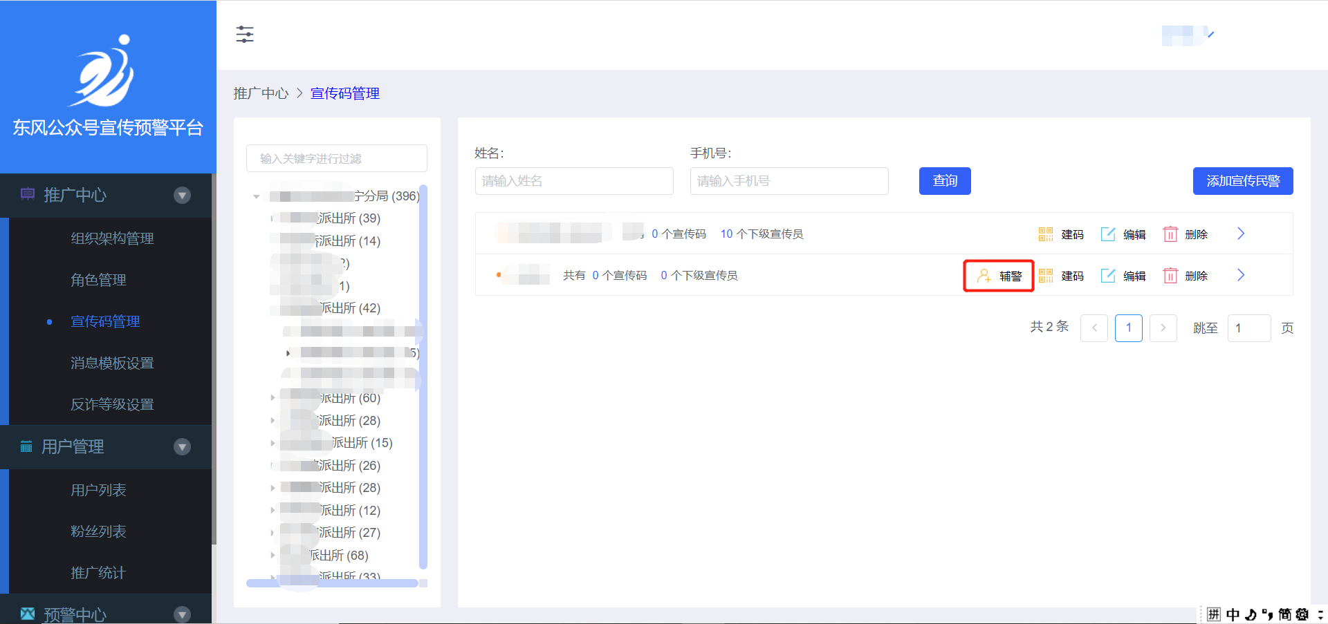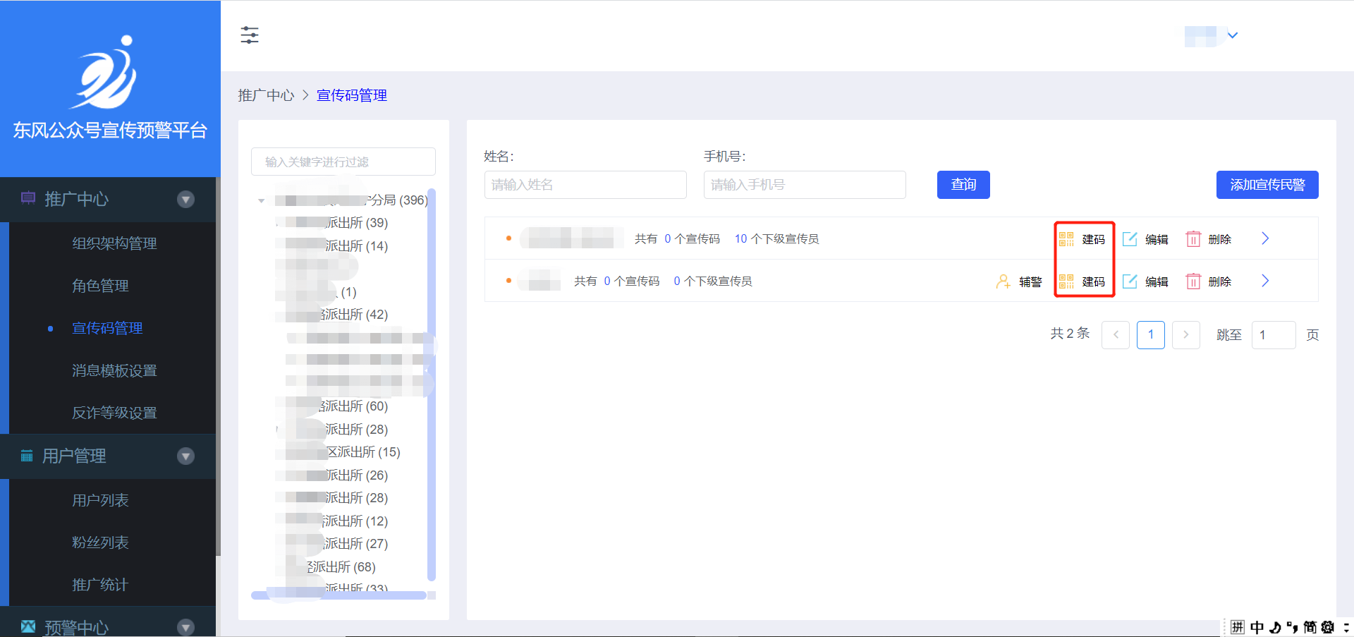 当添加完宣传员或下级宣传员后(以下简称用户),需要对用户进行建码操作。建码后,用户在[民警端](民警端.md)才可看到自己的专属宣传码