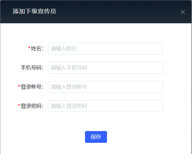 按要求输入下级宣传员姓名、帐号、密码后点击保存即可