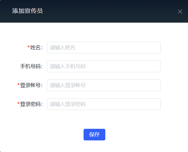 按要求输入宣传员姓名、帐号、密码后点击保存即可。此处建议使用宣传员的警号作为登录帐号