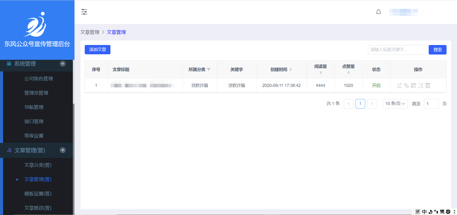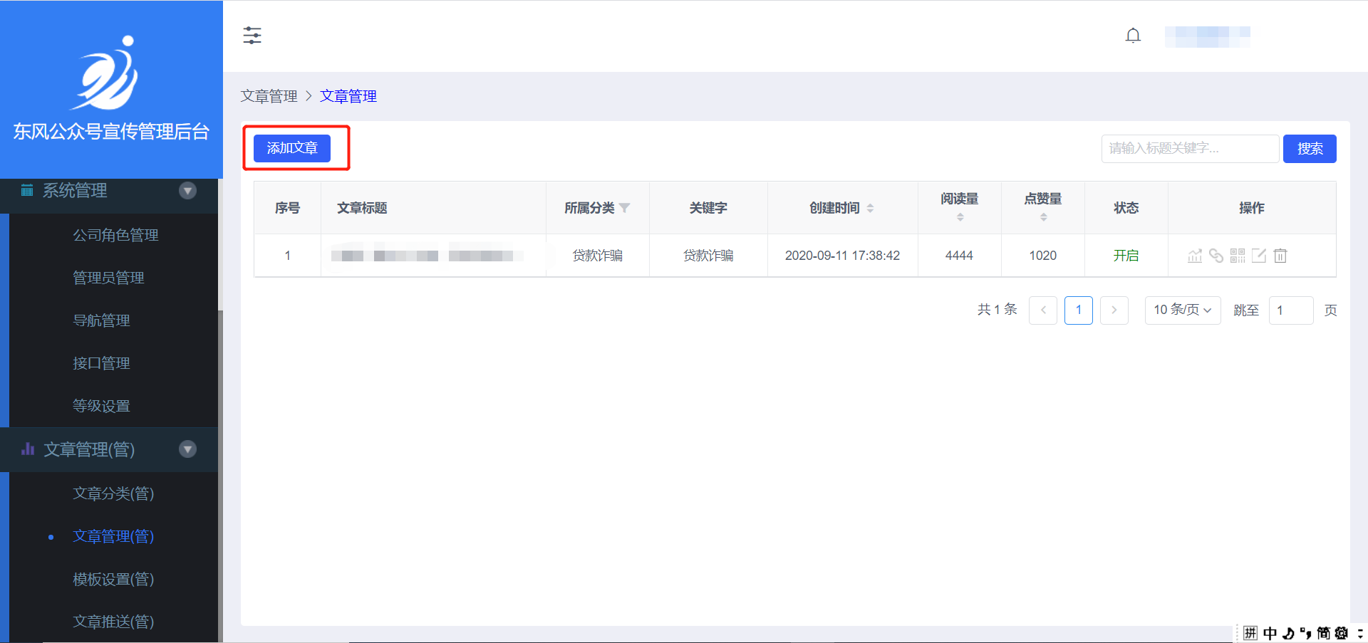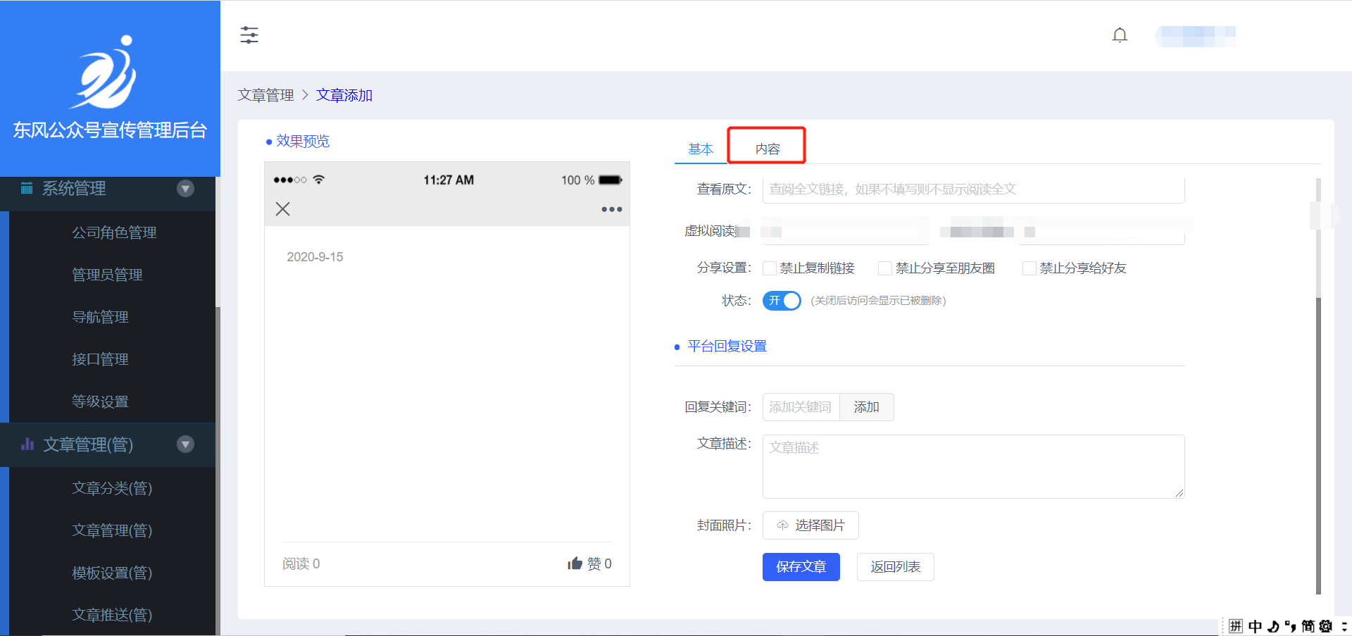 点击左侧的按钮【添加文章】,会出现如下页面:
