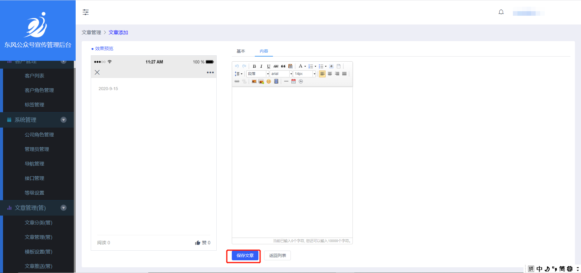 在右侧编辑文章内容,左侧可查看效果。点击下方的【保存文章】按钮即添加成功。