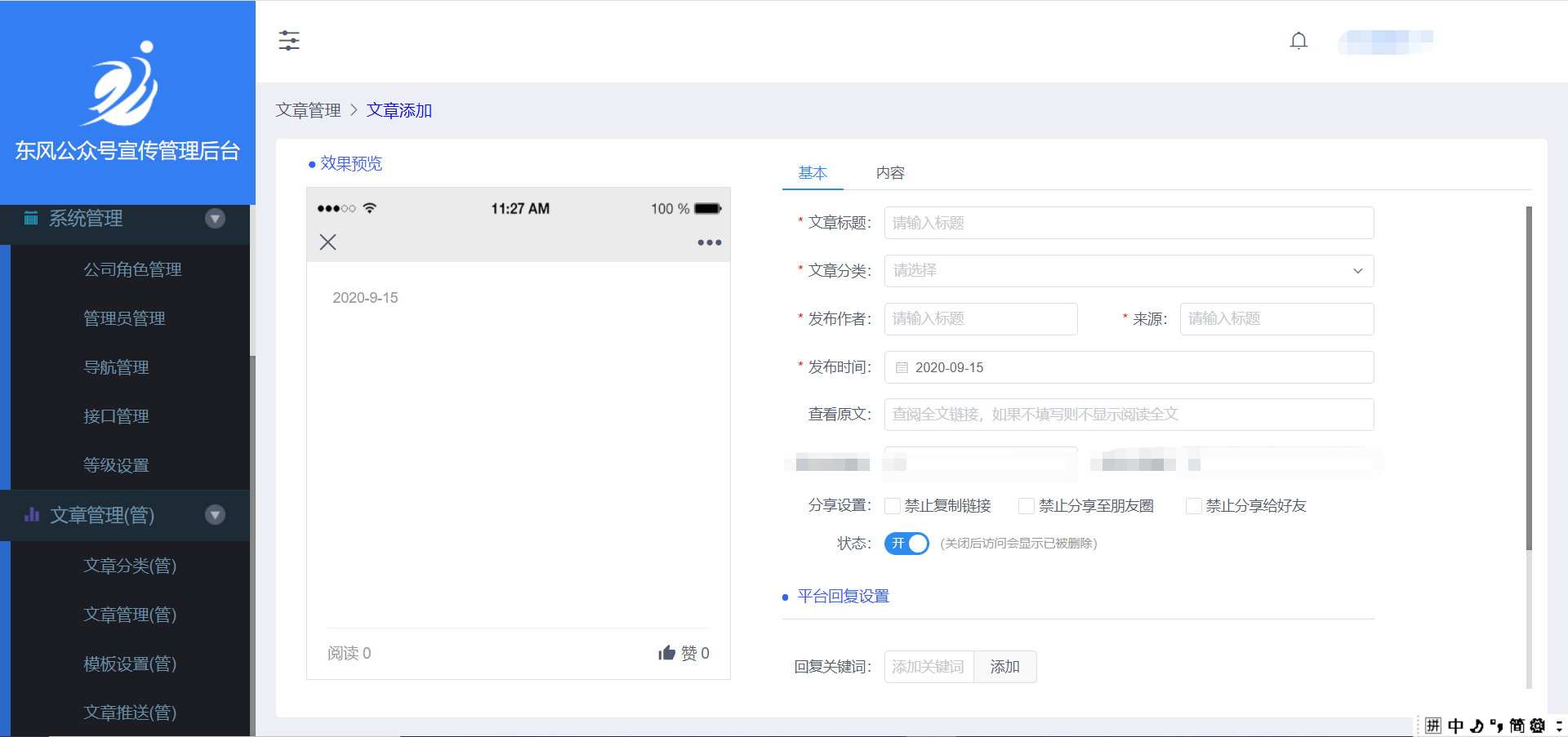 可在右侧设置文章的基本属性(如文章分类等)和平台回复内容,同时在左侧预览效果