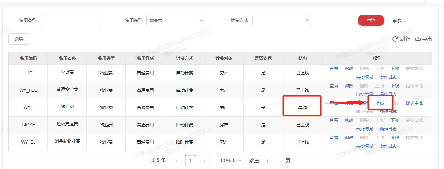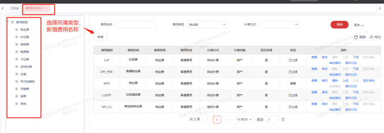 已上线费用先下线在修改或删除(若费用项已产生费用,在不能删除)