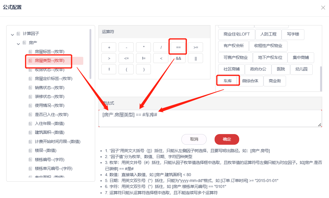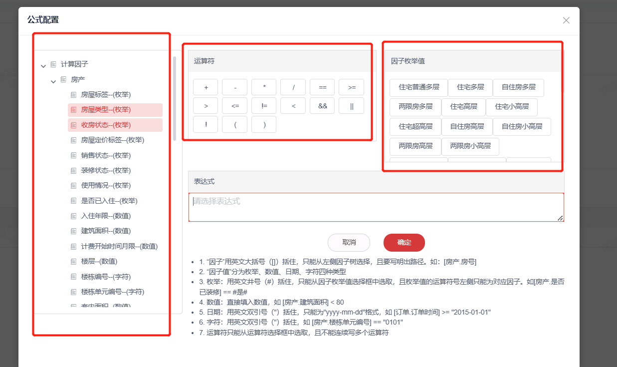 可根据‘房屋类型’、‘销售状态’等不同的类型配置表达式,配置界面下方有说明;