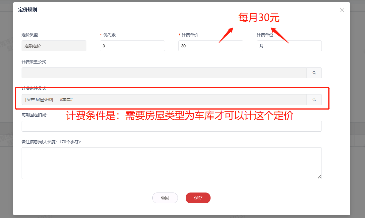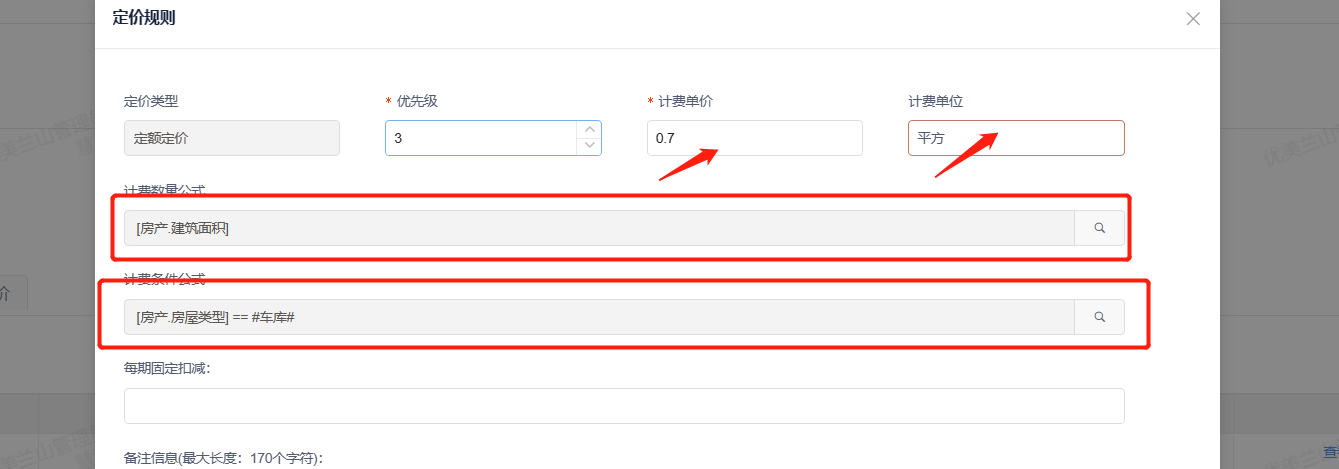 为\[房产.套内面积\] 时,计费出来应收金额=房产的套内面积\]X单价。