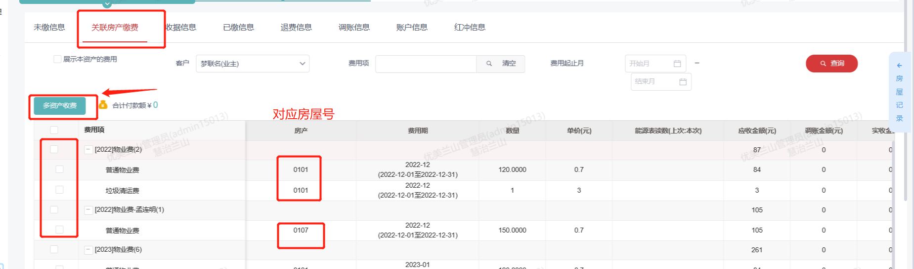 点击关联房产缴费——选择对应的房屋——多资产收费——缴费即可