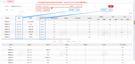 2、【日开票统计】:可按收费时间段或者核账时间段查询,对应支付日或者支付月的开票数据统计。