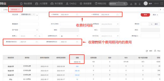 5、【费用明细】:查询某一天或一个时间段内收取的某一个费用期间的费用合计和明细情况。(不显示已作废的费用)