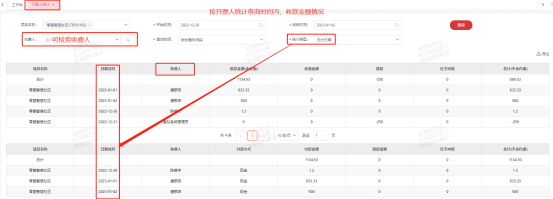 3、【开票人统计】:按开票人统计查询时间段内,对应收据的收款金额、收款方式等情况。