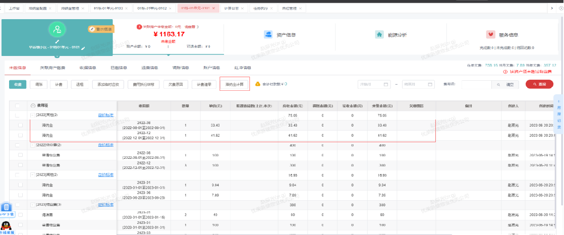对应的房屋收费界面增加滞纳金计算按钮,点击计算滞纳金按钮会计算出当前房屋所有有配置的费用所产生的滞纳金