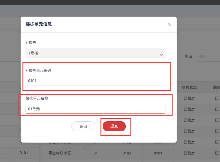 2.填写单元信息,楼栋单元编码为四位数,前边两位为楼栋编码,后边两位为单元编码,楼栋单元名称可自定义,填写完成后点击提交。