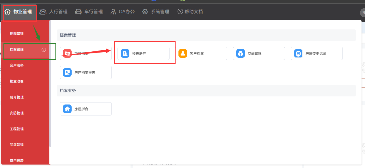 ## 1.点击菜单:**物业管理 > 档案管理 > 楼栋房产**。
