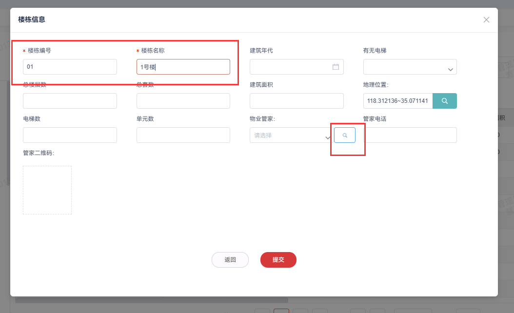 3.填写楼栋信息,楼栋编号为两位数 例:1号楼填写01,楼栋名称可自定义填写,填写完成后点击提交。
