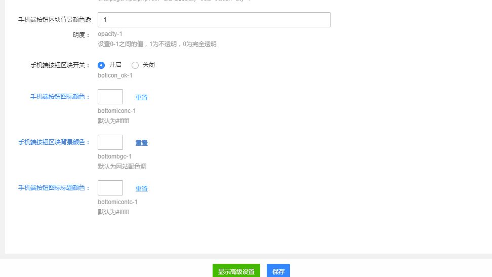 设置按钮:不同模板点击底部区块的设置,功能设置是不一样的,可进行区块的开关,色调等设置,具体以当前使用的模板风格为准。