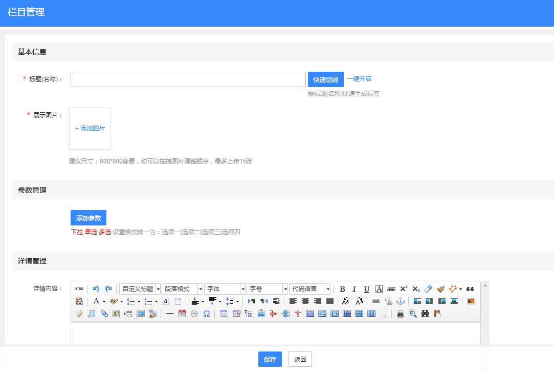 添加内容,编辑内容基本信息、详情、参数、产品包装详细内容
