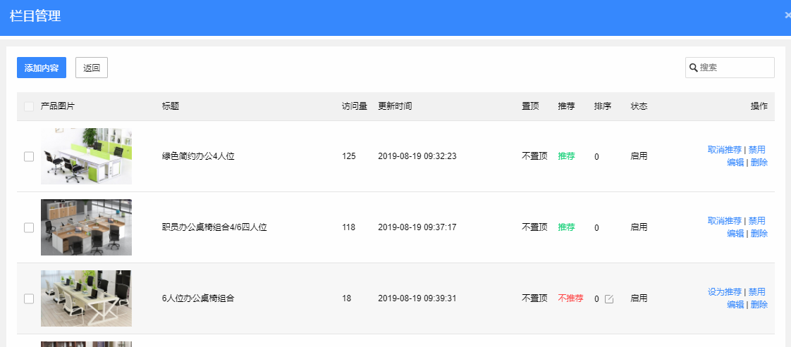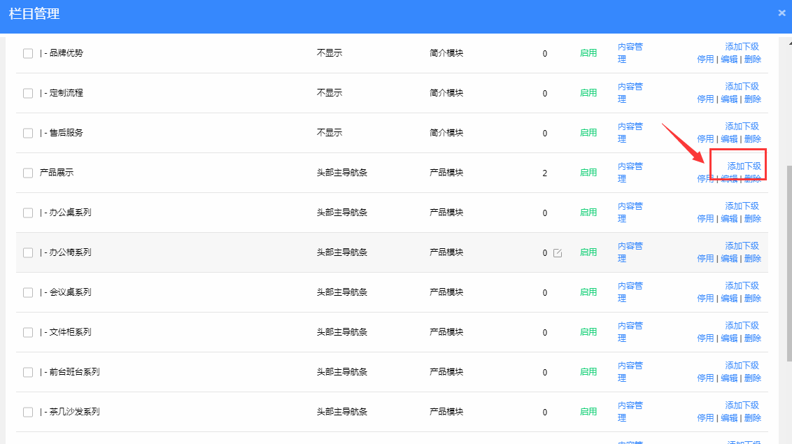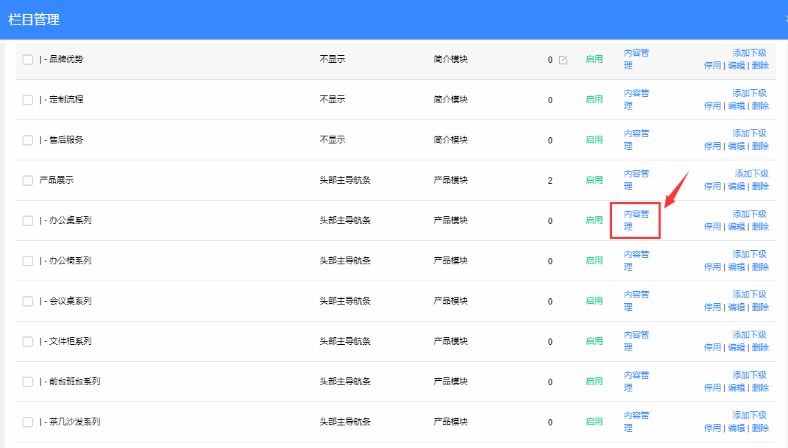 点击栏目管理,进入到产品栏目的内容管理,编辑产品的内容
