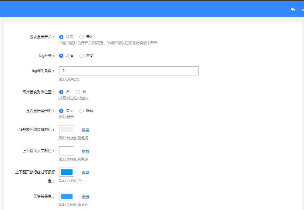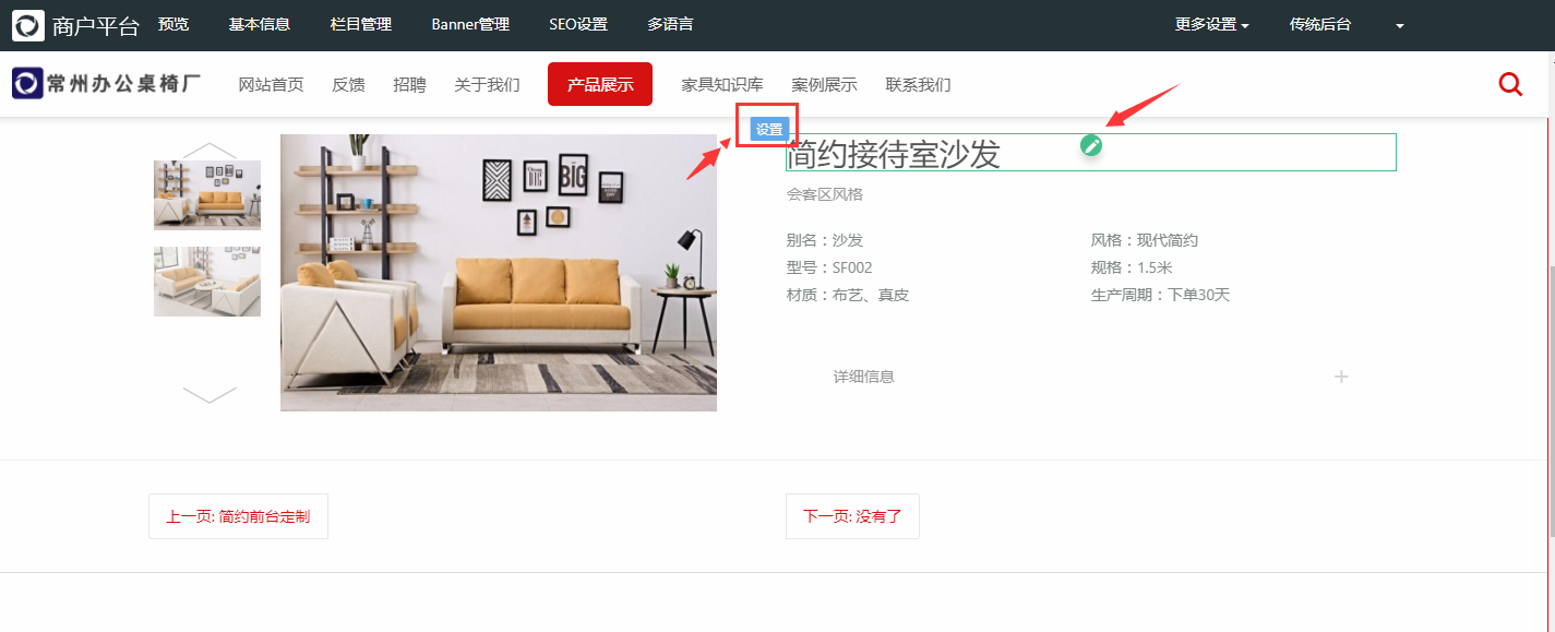 设置:修改区块的展示样式,区块开关、风格色调等,不同模板的产品列表页点击设置的功能是不一样的,具体以当前模板的设置为准。