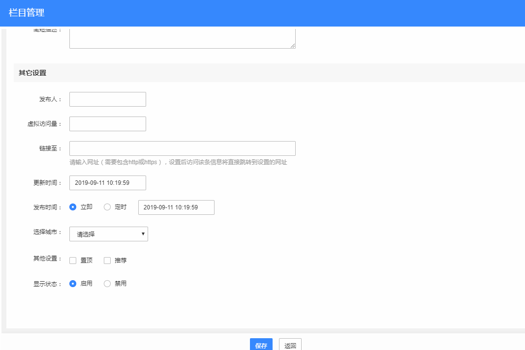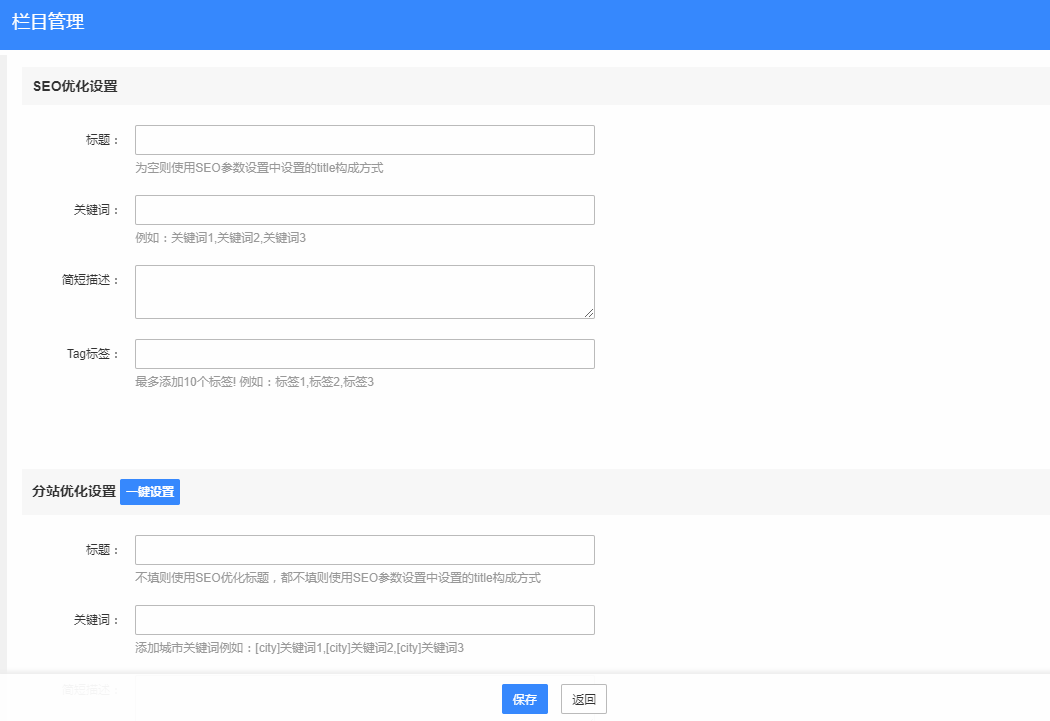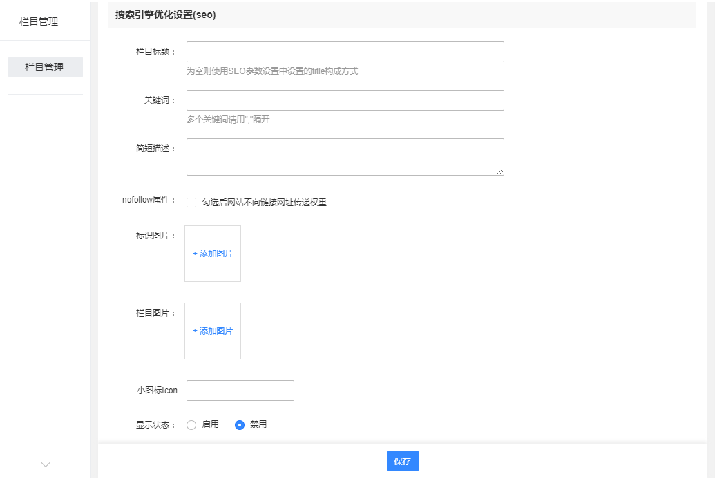 点击新增栏目,编辑栏目基本信息及搜索引擎优化设置