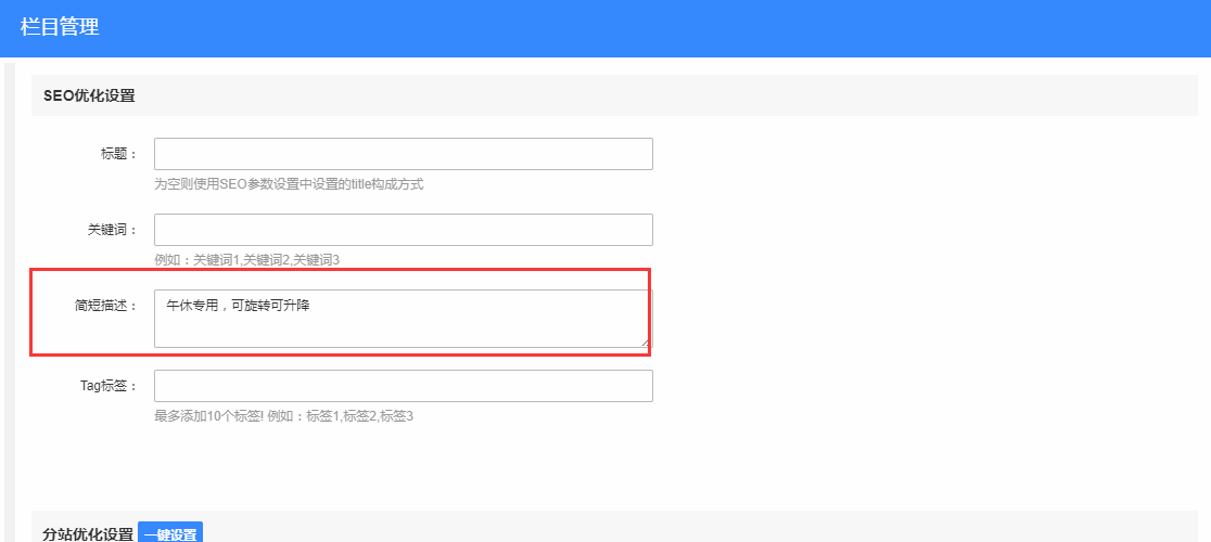 搜索引擎描述则在栏目管理列表处点击一级栏目进行编辑,填写简短描述内容
