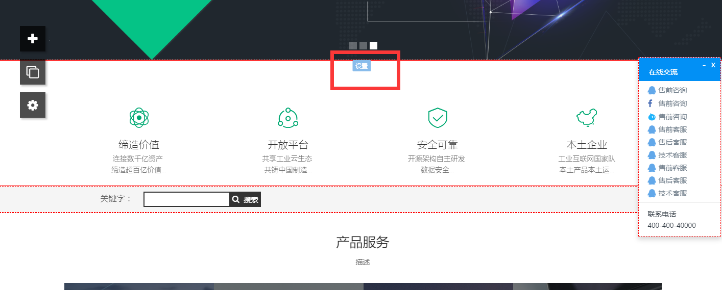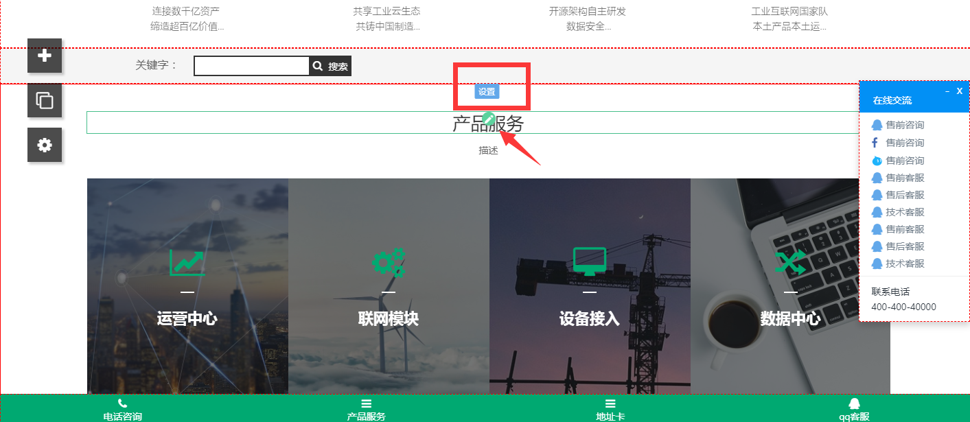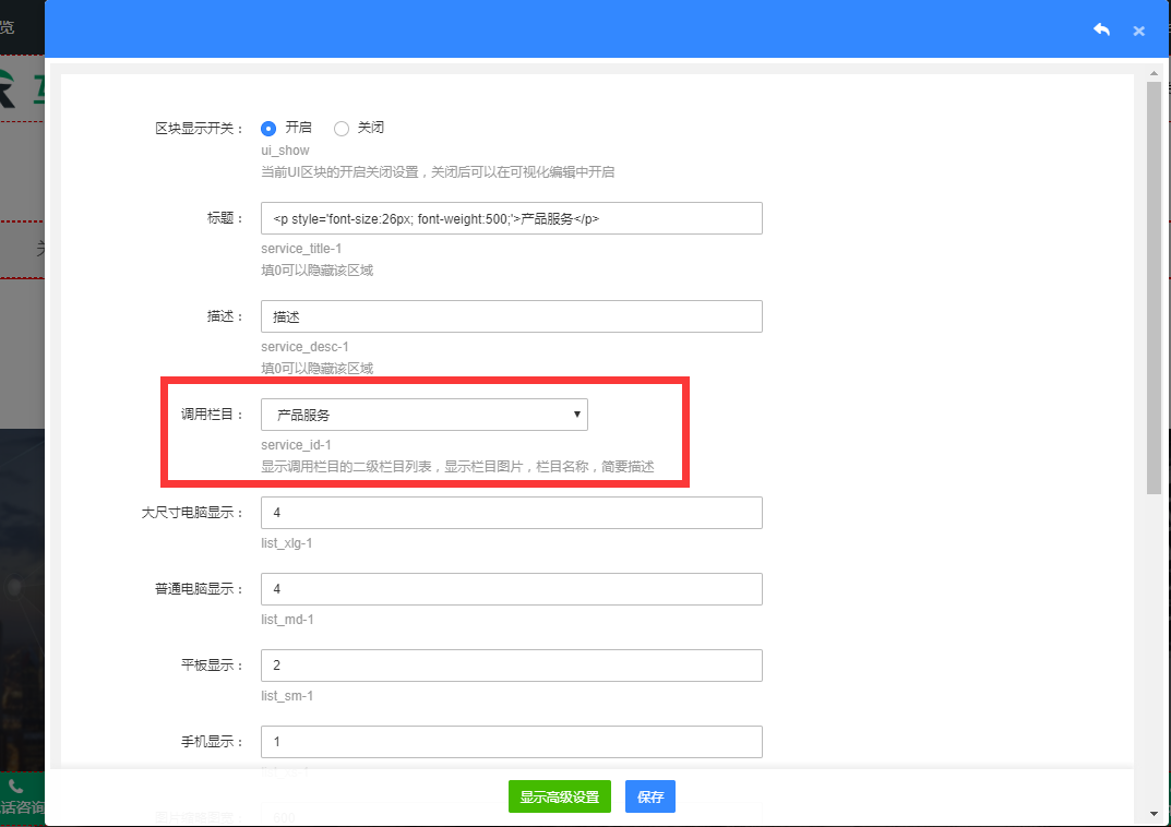 以当前模板为例,首页的「产品服务」区块,则是显示子栏目及子栏目下的内容列表,点击区块的设置,可查看到调用栏目设置的配置说明,那么在调用栏目时,则需要选择有子栏目且是内容列表的栏目模块(新闻,产品,图片等模块)。