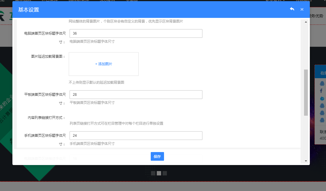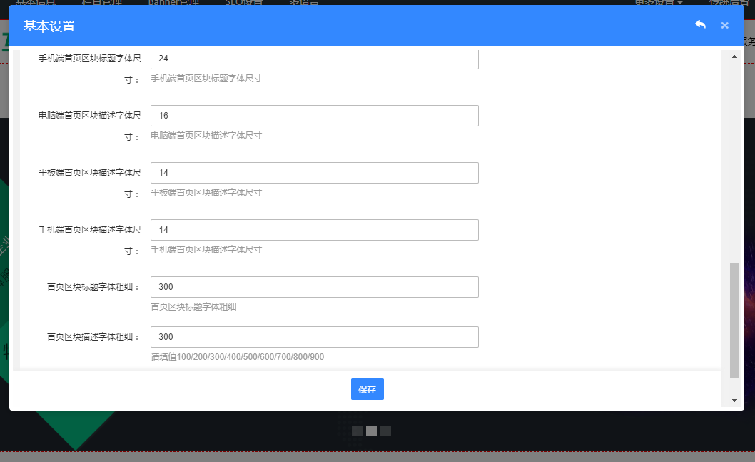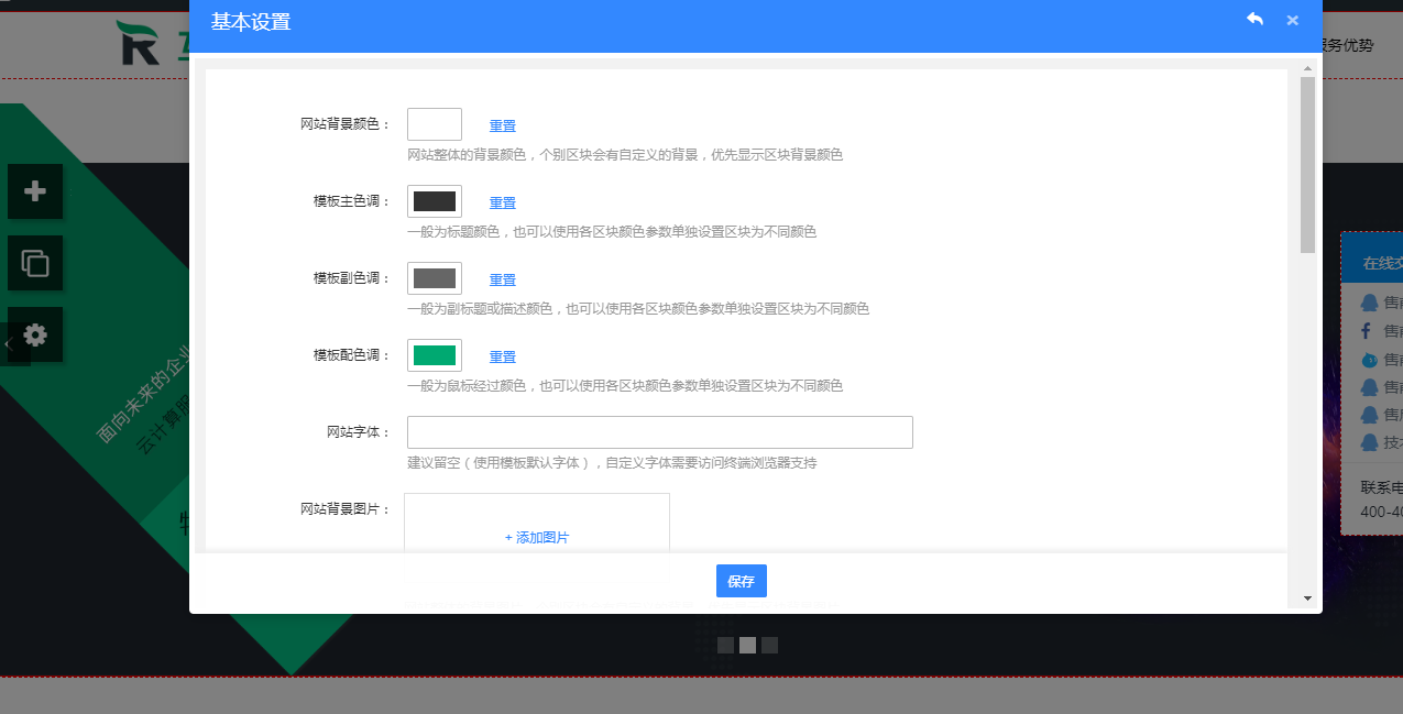2、基本设置包括网站颜色、色调、字体、背景图、各个描述文字的字体尺寸及各个终端显示效果设置