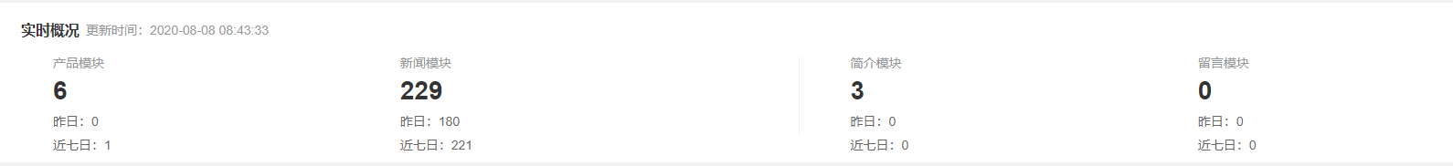可实时查看网站内-产品模块、新闻模块、简介模块、留言模块实时更新数据,方便对网站优化推广信息掌控及面试和客户反馈信息实时掌握。