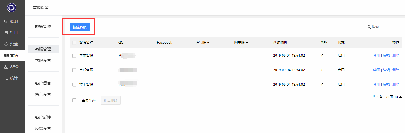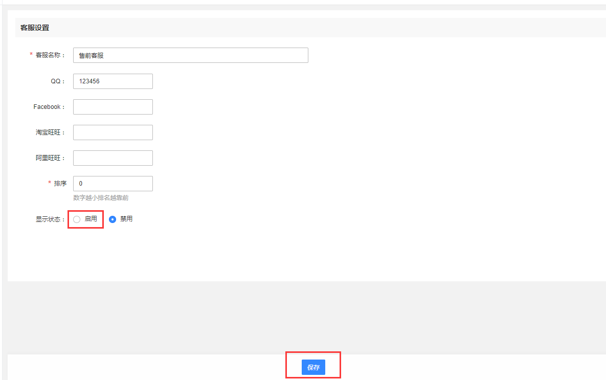 设置客服名称 填写客服沟通联系方式:Facebook,QQ,淘宝旺旺,阿里旺旺等,可根据实际情况及需要自己设置填写