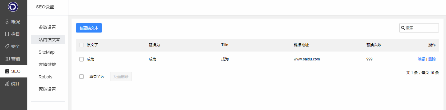 点击可视化编辑后台— SEO — 站内锚文本仅作用于前台页面中的内容文字,比如文章详情页内容文字