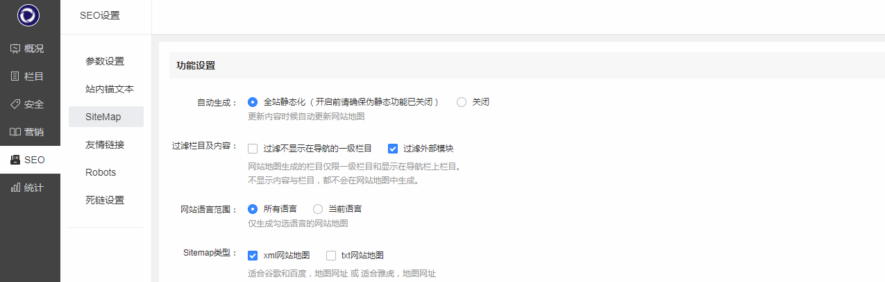 可以过滤不在网站前台显示的栏目或外部栏目。(网站地图生成的栏目仅限一级栏目和显示在导航栏上栏目。不显示内容与栏目,都不会再网站地图中生成。)