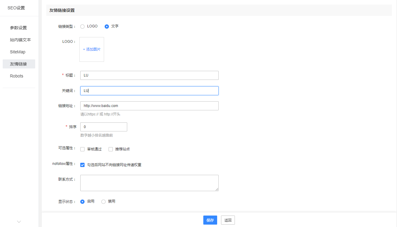 分文字和LOGO 两种,LOGO 链接需上传 LOGO 图片。