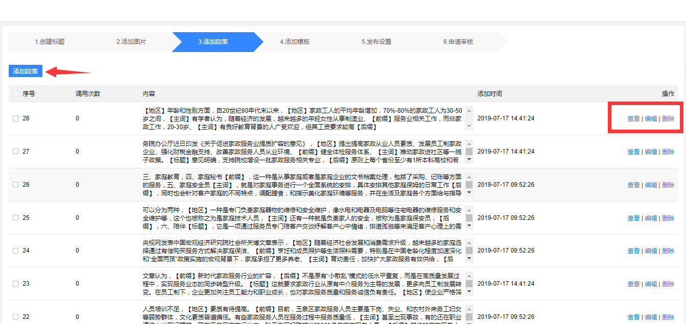 第三步:添加段落 每次发布要求最低50段落,一般素材采用产品知识,行业知识