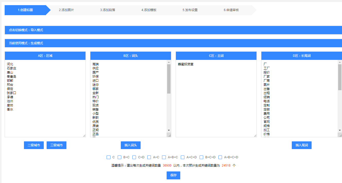 第五步:发布设置 每次推送上限是2000篇,会在第一步组合的词内系统随机生成发布