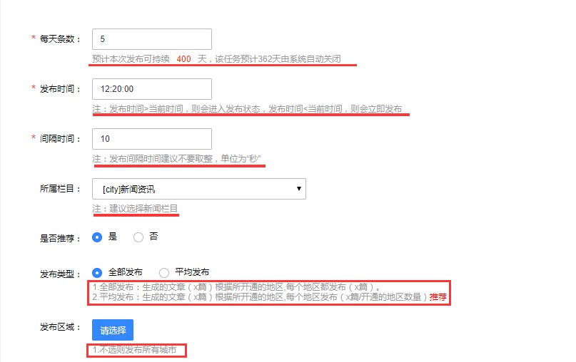 每天条数:如果设置100条每天,那么系统会在20天内自动发布完2000篇,之后需要再次维护;