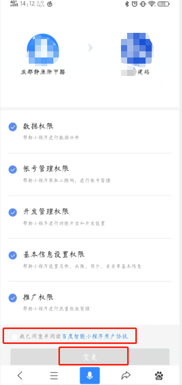 手机上选择要授权的小程序,勾选我已同意并阅读百度智能小程序用户协议,点击变更进行授权