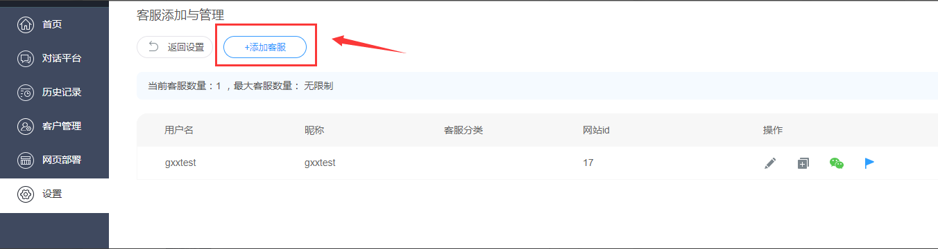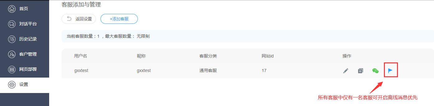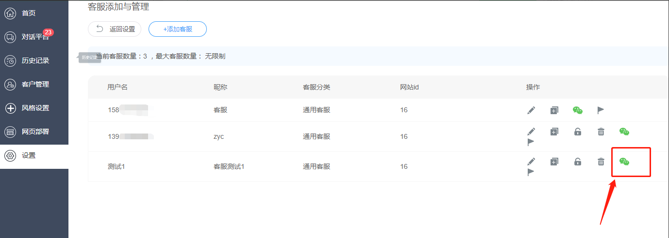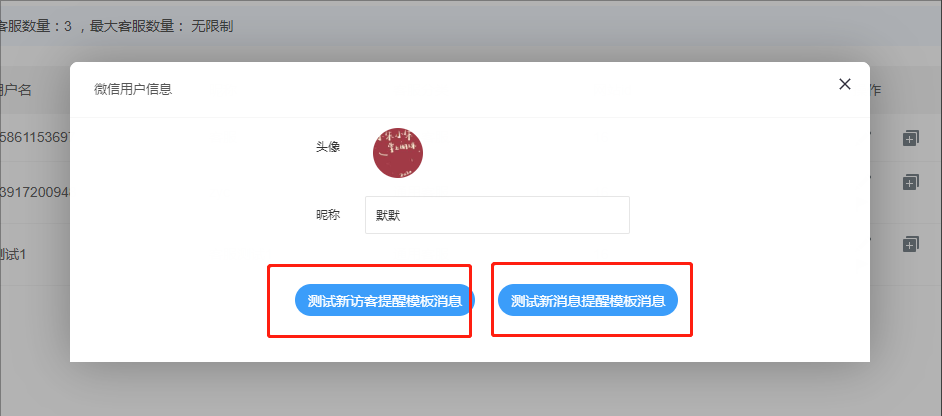 2、设置-客服添加与管理界面,需要接收离线模板消息的客服点下图的微信图标