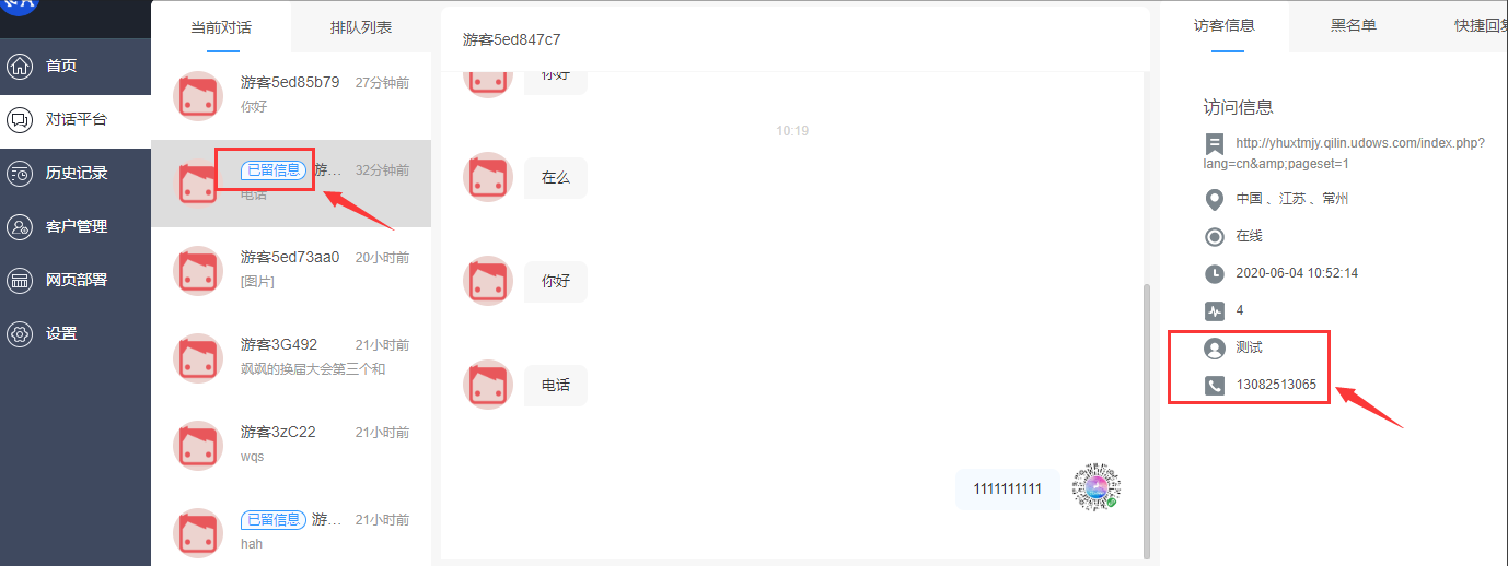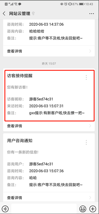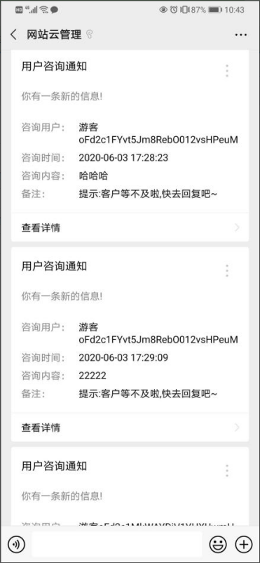手机端显示如下图,点击模板消息可直接与访客进行聊天