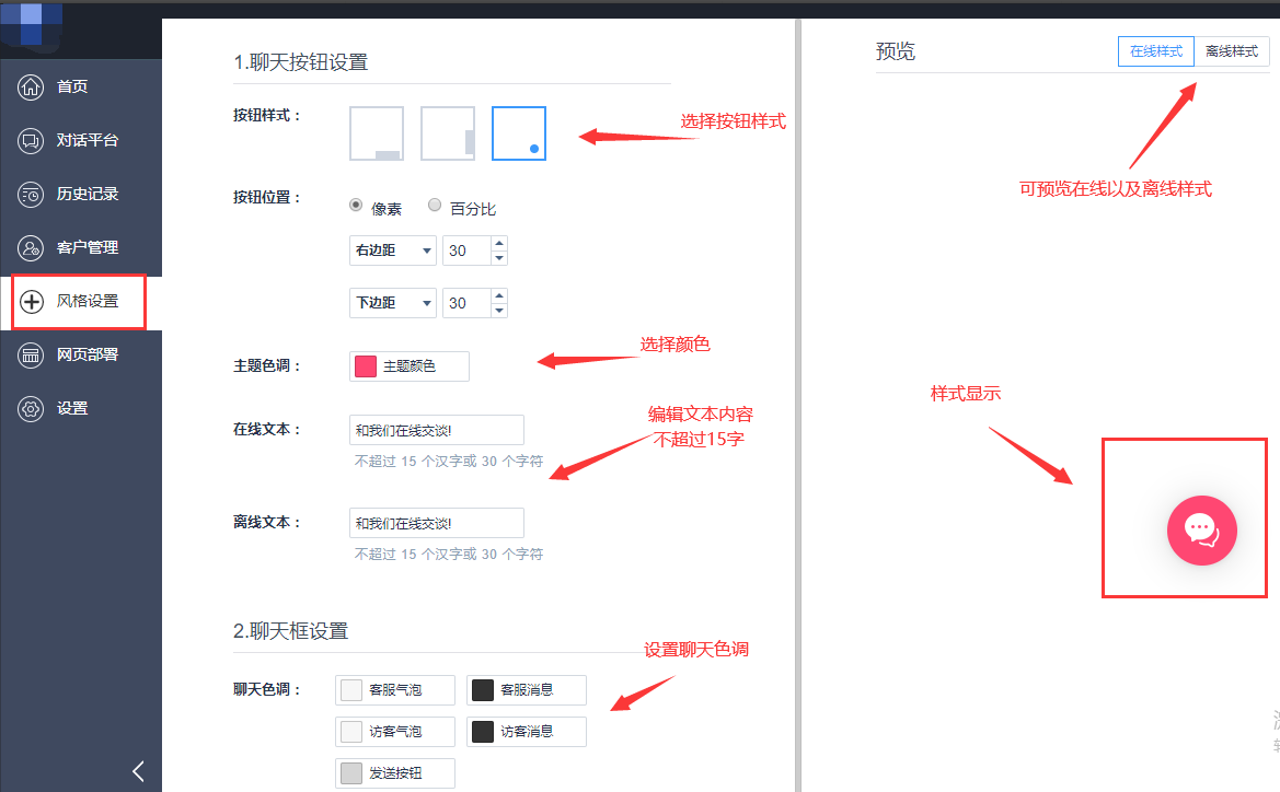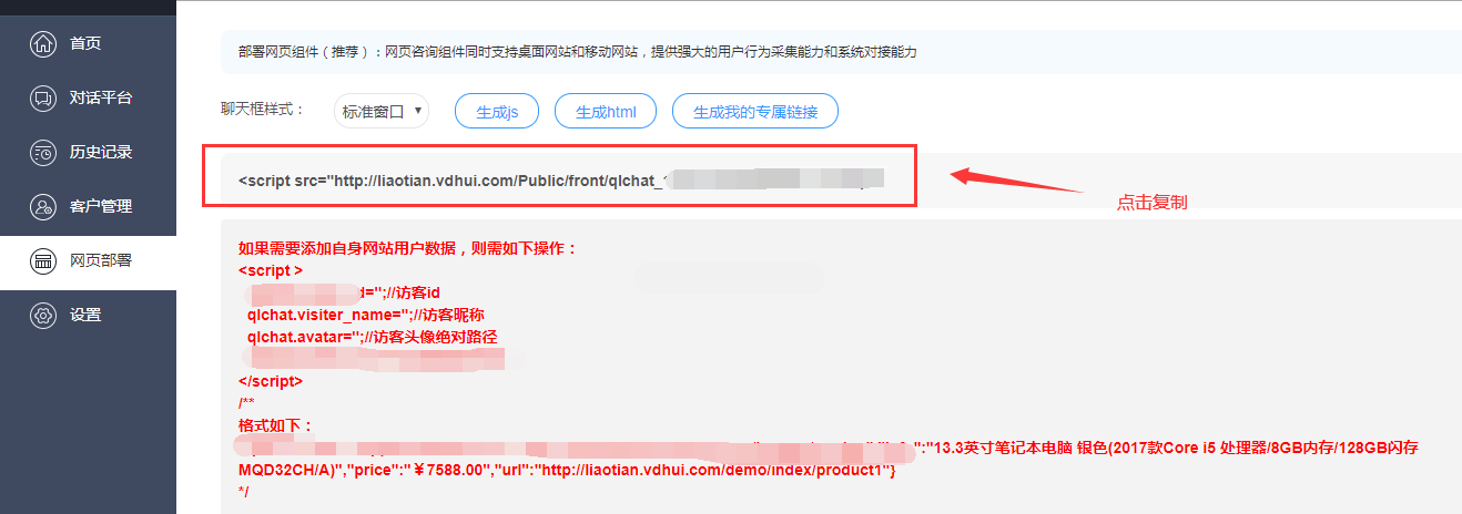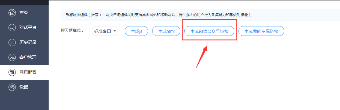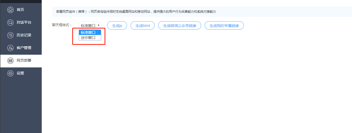 最后点击网页部署—生成js(聊天框样式有标准窗口和迷你窗口)