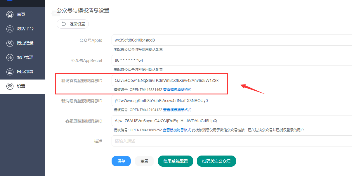 新访客提醒模板消息ID(当客服离线时新用户第一次点击对话窗口,则会发送消息提醒给客服)