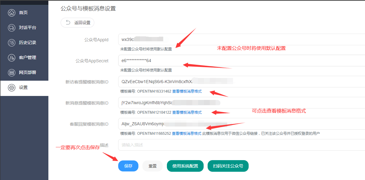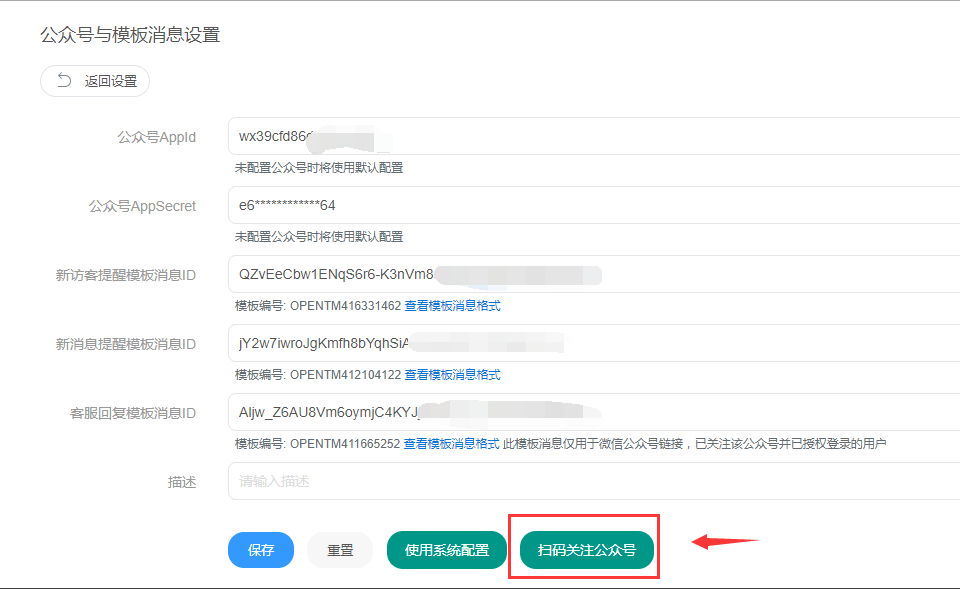如果未配置公众号时将使用默认配置 一定要再次保存