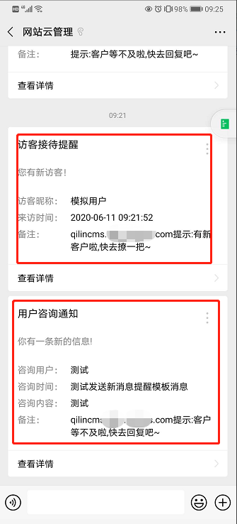 扫完之后刷新一下,会有以下提示,点击测试新访客提醒模板消息和测试新消息提醒模板消息,手机端会收到模板消息提醒。接收到模板消息提醒的话就说明此微信已绑定成功,如果接收不到说明此微信没有绑定成功