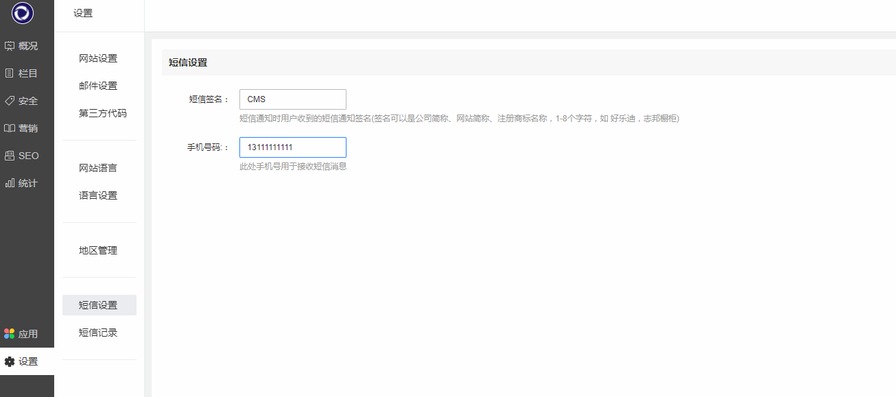 设置短信签名及接收用户提交数据的相关通知短信(一般为网站管理员)