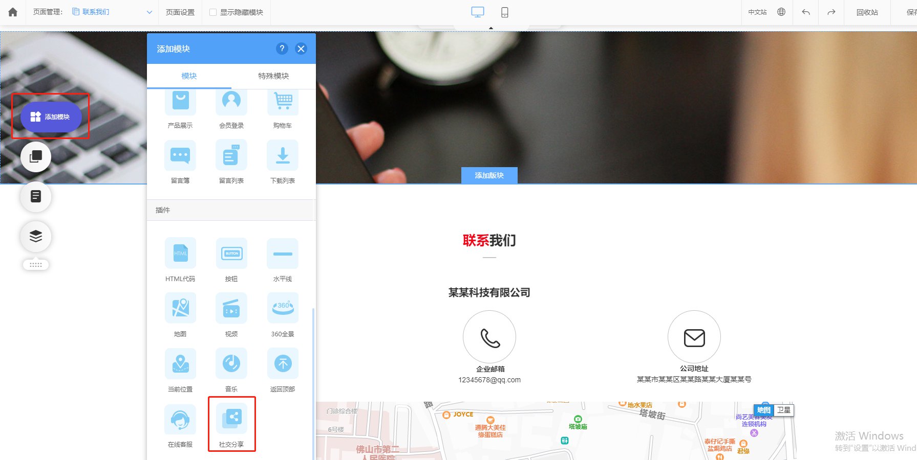 * 路径:网站编辑页面——添加模块——社交分享——拖动到页面合适位置