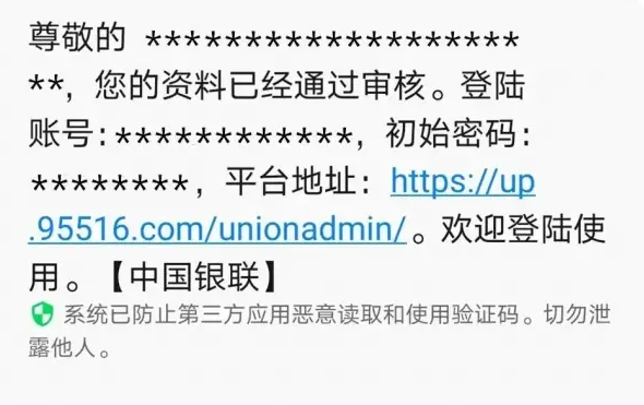 提交资料完成之后,请耐心等待审核,工作日一般24小时内审核完毕,审核成功之后,会收到中国银联系统发出的商户账号和初始密码。申请时填写的邮箱里面会有对接密匙