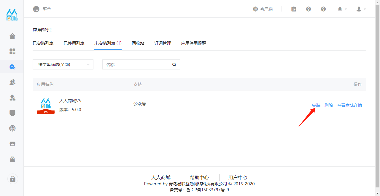 * 进入微擎,应用管理-->未安装应用,找到人人商城V5,点击安装