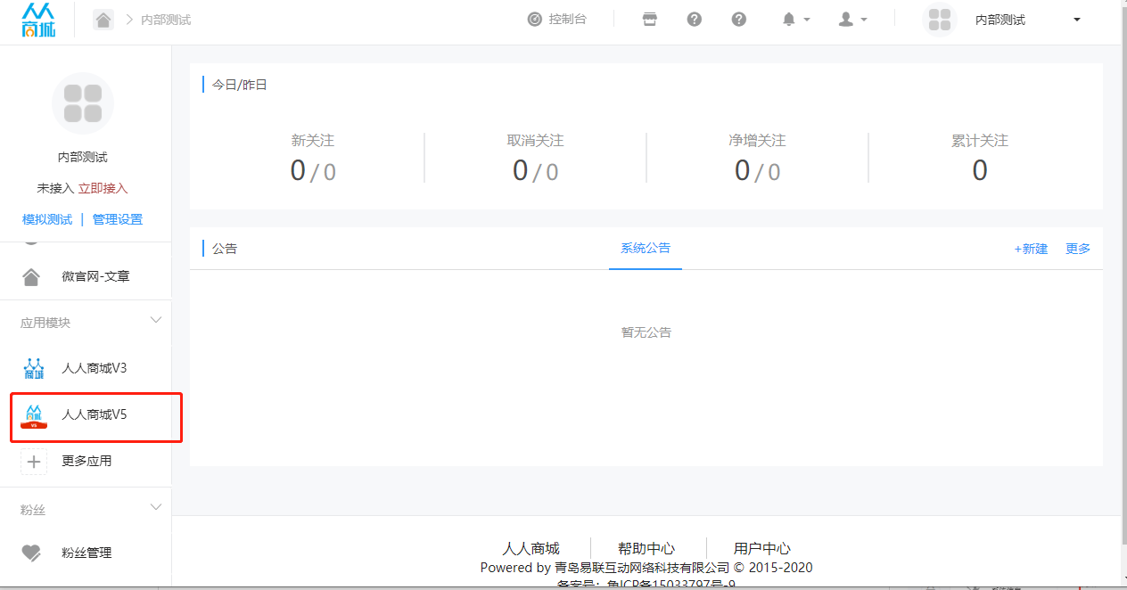* 收到授权码后,随便进入微擎公众号,接不接入不影响后续操作,但是必须给这个公众号分配人人商城V5的使用权